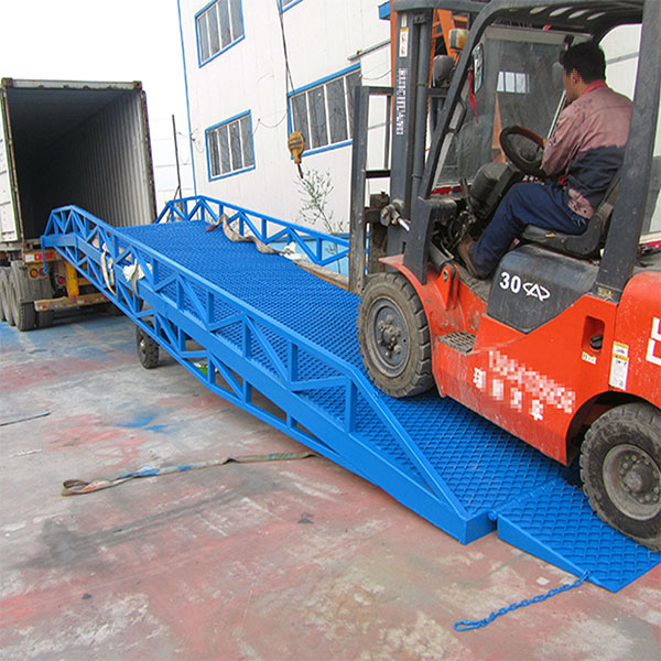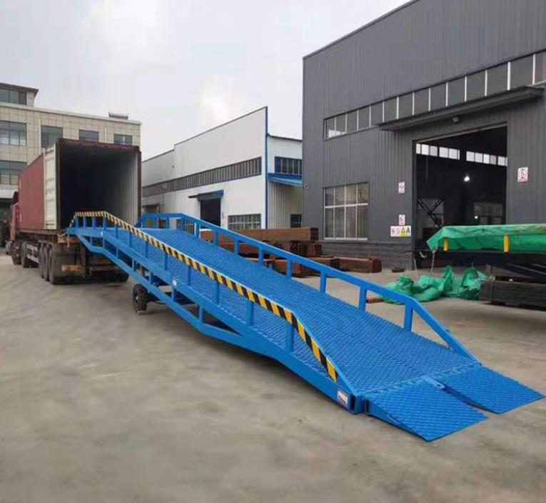 移動登車橋是實現貨物快速裝卸的專用輔助設備,它的高度調節功能使貨車與庫房的貨臺之間架起一座橋梁,叉車等搬運車輛通過它能直接駛入貨車內部進行貨物的批量裝卸,僅需單人作業,即可實現貨物的快速裝卸。移動液壓登車橋使企業減少大量勞力,提高工作效率,獲取更大經濟效益。臺面均設計為網格狀鋼板,這種結構能保證具有很好的強度,又具有防滑功能,還能方便地清掃工作臺面,使它能經常地保持清潔、美觀。移動液壓登車橋無須外接電源,通過手搖泵做動力能輕松地在其整個調整范圍內按50mm的倍數進行高度的調整??梢猿浞诌m應各種不同高度的貨車.