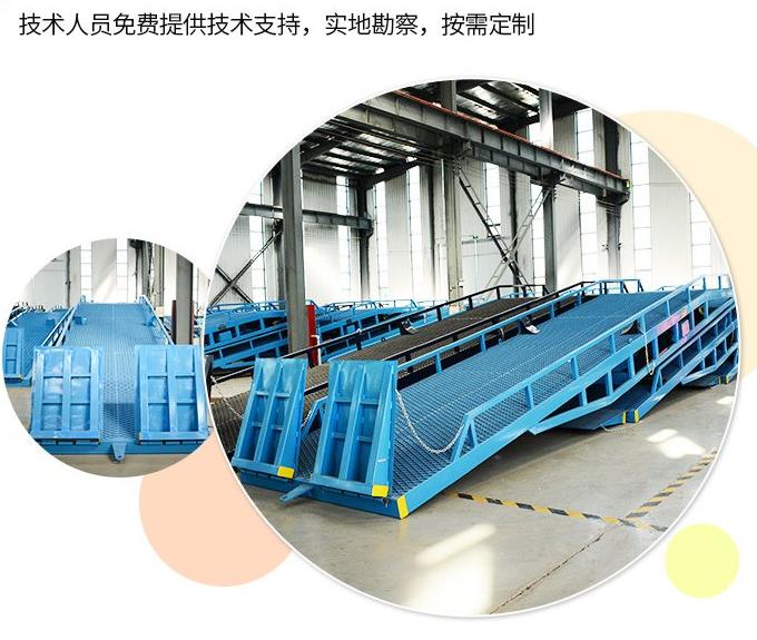 移動登車橋坡面采用特制的高強度齒形鋼格板,具有防滑性能,使叉車有更好的爬坡能力和操控性。即使在雨雪天,仍能保障正常作業。隨機配置的剎車墊,能有效防止叉車在登車橋上行走作業時,登車橋發生溜車及移動以保障作業安全。用戶在選購登車橋時,應根據自己的使用范圍,使用頻繁程度,利用率,額定起重量等因素進行綜合考慮,選擇適合本單位使用要求的登車橋